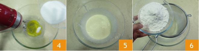 Derrita la mantequilla a fuego muy bajo y deje que se temple. Vierta los huevos en un bol grande y comience a batirlos con las varillas eléctricas, añadiendo el azúcar poco a poco 4. Deberá obtener una mezcla clara y espumosa 5. En este punto tamice directamente en el bol la harina 6,