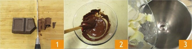 Para preparar la tarta fantasma, primero picad el chocolate negro 1 y derretidlo al baño maría o en el microondas 2 y dejad que se temple. Mientras tanto, poned en el bol de la batidora planetaria con varillas la mantequilla ablandada 3.