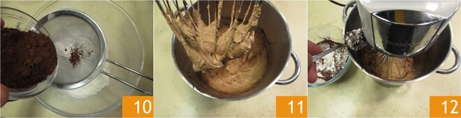 Tamizad también el cacao 10. Retomad la masa que se ha amalgamado bien 11 e incorporad los polvos 12.