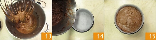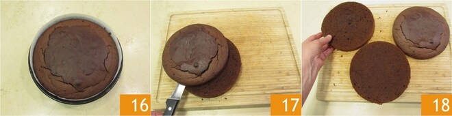 Pasado este tiempo, verificad la cocción con un palillo, luego sacad del horno y dejad enfriar 16 antes de retirar la tarta del molde. Una vez fría, cortad la tarta en 3 discos 17 18.