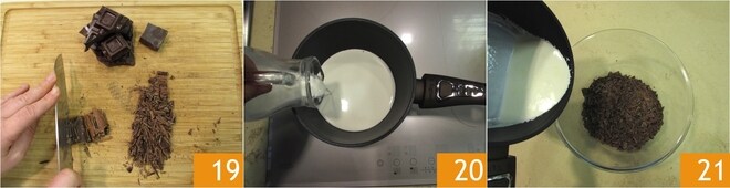 Mientras tanto, preparad la ganache de chocolate. Picad el chocolate negro 19 y poned en el fuego un cazo con la nata 20. Cuando la nata esté a punto de hervir, vertedla sobre el chocolate picado 21.