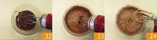Mezclad con las varillas para disolverlo completamente 22. Una vez que el chocolate se haya disuelto, trasladad la mezcla a un bol con hielo y continuad trabajando con una batidora eléctrica 23 hasta que esté bien montada 24.
