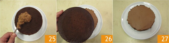 Ahora con una espátula extendid la ganache en el primer disco 25, colocad el segundo disco 26 y presionad para que se adhiera bien. Completad con el tercer disco y rellenad también la superficie con la ganache 27, distribuyéndola con una espátula. Trasladad la tarta a la nevera, justo el tiempo necesario para preparar los fantasmitas.