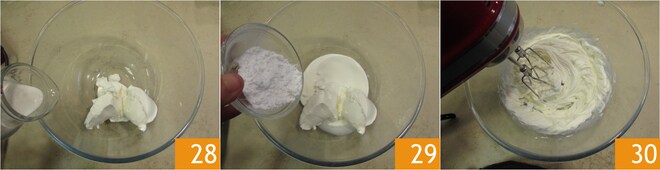 En un bol trabajad el mascarpone con la nata 28 y el azúcar glas 29, montad con unas varillas eléctricas 30 hasta que esté bien firme. Pasad la crema a una manga pastelera con boquilla lisa de 15 mm de diámetro.