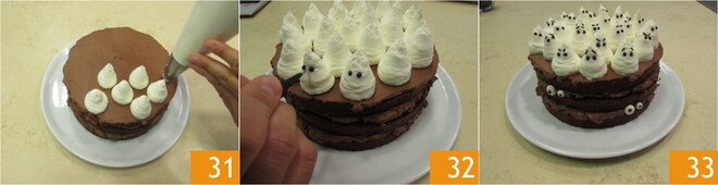 Formad los fantasmitas exprimiendo unos montoncitos en la superficie de la tarta 31 y decoradlos con fideos y confites de chocolate para crear ojos y cejas 32. Guardad vuestra tarta fantasma en la nevera hasta el momento de servirla 33.