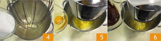 Verted el azúcar 4, añadid una pizca de sal y trabajad con las varillas eléctricas hasta obtener una mezcla suave y cremosa. Agregad 2 de los 4 huevos 5 y continuad trabajando hasta que se absorban completamente. Incorporad también el chocolate fundido 6 y mezclad la preparación con las varillas.