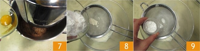 Continuad añadiendo los huevos restantes 7, mezclando siempre con las varillas hasta que se absorban completamente. En este punto, tamizad dentro de un bol la harina 8, la fécula de patata y la levadura 9.