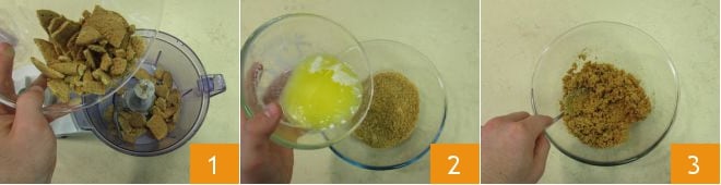 Para preparar la tarta fría al hielo de sandía comience forrando la base de un molde de 24 cm con papel de horno, tanto en la base como en la circunferencia. Derrita la mantequilla, en el microondas o en el fuego, y mientras tanto vierta las galletas en la batidora 1. Accione las cuchillas para obtener una mezcla arenosa, transfiera a un bol y vierta la mantequilla 2. Mezcle con la cuchara 3