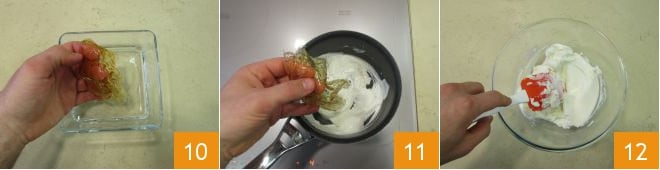 Tan pronto como esté caliente, escurra la gelatina 10 y sumérjala en el cazo, mezcle hasta que se disuelva completamente y apague el fuego 11. Deje templar unos minutos, mientras tanto vierta el queso crema en un bol grande y trabájelo con una espátula 12.