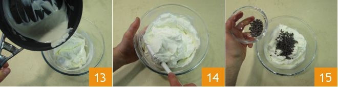 Incorpore el yogur con la gelatina disuelta 13, mezcle y luego incorpore con delicadeza la nata 14. Finalmente, agregue también las gotas de chocolate reservando un puñado para la decoración 15.