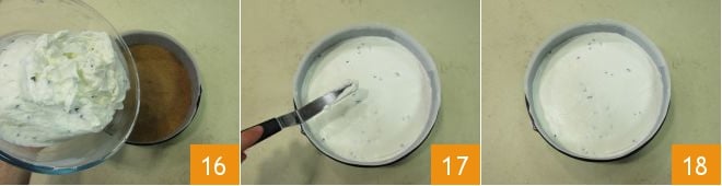 Transfiera la crema al molde 16, nivele para obtener una superficie lisa 17 y deje cuajar en el frigorífico durante al menos 1 hora 18.