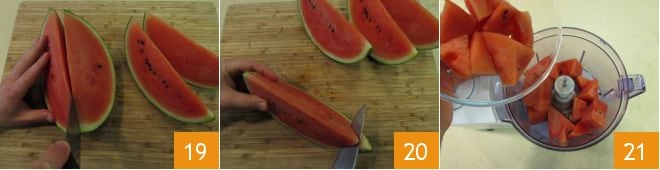 Mientras tanto prepare el hielo de sandía, corte la fruta en rodajas 19, retire la cáscara 20 y obtenga trozos grandes. Vierta estos últimos en la batidora y accione las cuchillas hasta obtener un puré 21.