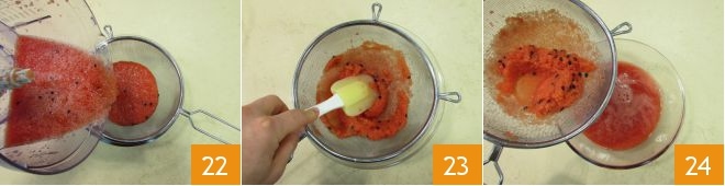 Vaya colando todo en un colador colocado en un recipiente 22 y tamice cuidadosamente 23 para descartar la pulpa no filtrada y las semillas 24. Debe obtener 500 g de jugo.