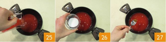 Vierta el jugo en un cazo 25 y agregue el azúcar 26, la canela 27