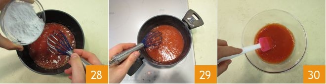 y, mientras mezcla con el batidor, vierta también la fécula de maíz 28. Mezcle bien para evitar grumos y luego ponga el cazo en el fuego. Cocine a temperatura media alta hasta que obtenga una salsa como la crema pastelera 29. Transfiera a un bol y deje enfriar completamente, mezclando de vez en cuando para evitar que se forme una película en la superficie 30.