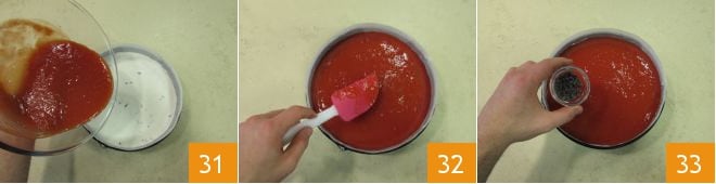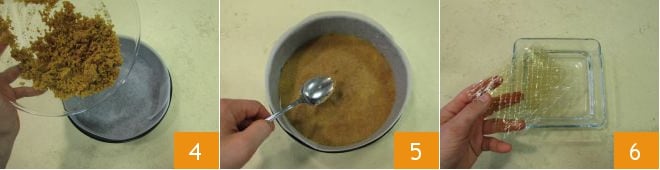 y vierta en un molde de 24 cm forrado con papel de horno 4, nivele cuidadosamente con el dorso de la cuchara 5. Mientras tanto, ocupe de la crema, deje fuera del frigorífico los ingredientes y ponga a remojo la gelatina en agua fría 6.
