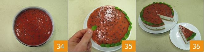 Pasado el tiempo, desmonte el molde y retire el papel de horno 34, coloque la tarta en el plato de servir y decore la circunferencia superponiendo hojitas de menta, recordarán la cáscara de la fruta 35. ¡Aquí está lista su tarta fría al hielo de sandía, sírvala bien fría 36!
