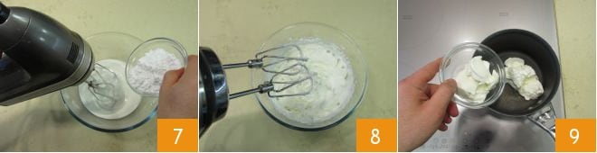 Luego vierta la nata en un recipiente y accione las batidoras a velocidad media alta mientras vierte el azúcar poco a poco 7. Aumente gradualmente la velocidad y bata casi a punto de nieve; reserve 8. Caliente el yogur en un cazo, sin dejar que hierva 9.