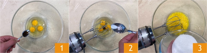 Para realizar la tarta invertida de melocotón, primero prepara la masa: derrite la mantequilla en un cazo y deja que se temple. En un bol grande, vierte los huevos, el extracto de vainilla 1 y la sal 2. Comienza a batir con las varillas eléctricas, luego añade el azúcar 3. Continúa trabajando hasta obtener una mezcla espumosa.