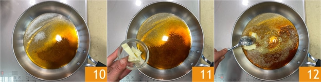 Para preparar el caramelo, vierte el azúcar en una sartén de fondo grueso y déjalo derretir a fuego muy bajo, sin tocarlo 10. Cuando haya alcanzado un bonito color ámbar, añade la mantequilla 11 y mezcla con una cuchara 12.