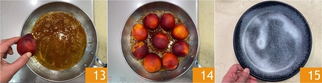 Coloca los melocotones en la sartén de modo que la parte cortada esté en contacto con el caramelo 13 y déjalos así durante un minuto, luego apaga el fuego 14. Mientras tanto, engrasa y espolvorea con azúcar un molde de 21,5 cm de diámetro en la base y 24 cm en la superficie 15.