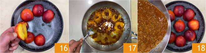 Saca los melocotones de la sartén y colócalos en el molde, siempre con la parte cortada hacia abajo 16. Mezcla el caramelo restante en la sartén 17 y viértelo sobre los melocotones 18.