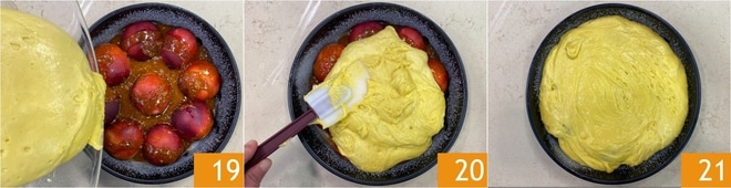 Por último, vierte también la masa 19 y nivela la superficie con una espátula 20. Hornea en horno estático precalentado a 175° durante 45 minutos 21.