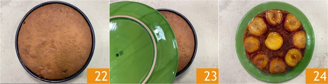 Transcurrido este tiempo, verifica la cocción con un palillo y saca del horno 22. Desmolda inmediatamente la tarta volteándola sobre el plato de presentación, teniendo cuidado de no quemarte 23. Deja que se temple y sirve tu deliciosa tarta invertida de melocotón, acompañada si deseas con una bola de helado de nata 24.