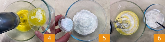 En este punto, vierte poco a poco la mantequilla derretida tibia, manteniendo las varillas en acción 4. Mezcla la harina y la levadura en un bol aparte 5, luego añade poco a poco los ingredientes secos a la mezcla 6.