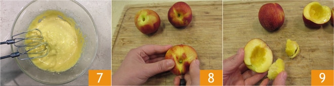 Continúa trabajando hasta obtener una masa lisa y homogénea 7. Deja a un lado y ocúpate de los melocotones: lávalos y pártelos por la mitad 8, luego quita el hueso 9.
