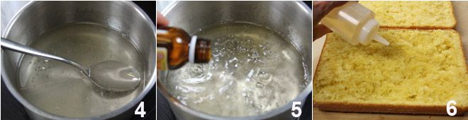 En un cazo, haz disolver el azúcar en el agua para formar un jarabe 4 y cuando haya alcanzado el hervor, déjalo cocinar durante 2-3 minutos, luego apaga el fuego y añade el alchermes (o el aroma que prefieras) 5. Deja enfriar el almíbar y luego humedece las dos mitades de la tarta por el lado cortado 6;
