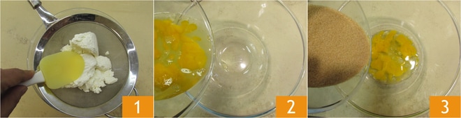 Para preparar la tarta mágica de ricotta, primero pon a escurrir la ricotta de oveja 1, así no soltará líquido durante la cocción. Vierte los huevos ligeramente batidos en un bol amplio 2, añade el azúcar moreno 3.