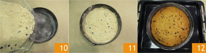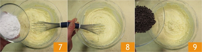 Ahora incorpora también la maicena 7. Continúa mezclando con el batidor hasta obtener una mezcla homogénea 8. Añade las gotas de chocolate 9 y mezcla con una espátula para integrar.