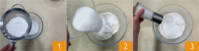 Para preparar la tarta margarita sin mantequilla, en un bol añadid harina y fécula tamizadas 1. Luego añadid azúcar 2, una pizca de sal 3.