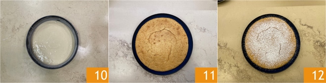 Engrasad y enharinad un molde de 22 cm de diámetro, verted dentro la masa 10, cocinad en horno estático precalentado durante unos 35-40 minutos a 180°. Haced la prueba del palillo, luego sacad del horno 11. Dejad enfriar y luego con abundante azúcar glas 12!
