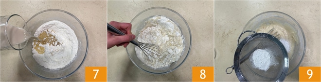 También añadid la leche vegetal 7, nosotros hemos usado la de soja. Mezclad y por último tamizad la levadura 9. Mezclad nuevamente para que se absorba.
