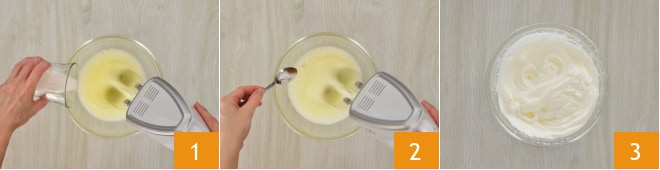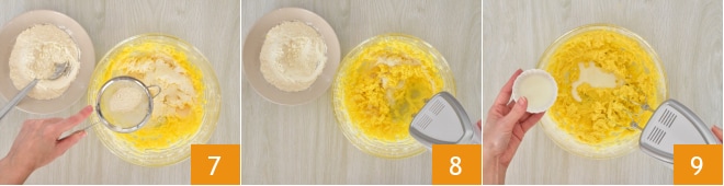 Tamizad la harina y la levadura en la mezcla 7 añadiendo poco a poco mientras continuáis mezclando con las varillas, a una velocidad más baja, 8. Cuando la mezcla esté absorbida, añadid la leche y luego quitad las varillas una vez incorporado 9.