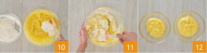 Armaos con una espátula e incorporad las claras montadas a nieve en dos veces: la primera parte servirá para ablandar la mezcla 10, la segunda para crear ligereza, así que incorporad con mayor delicadeza, haciendo movimientos de abajo hacia arriba 11. En este punto, dividid la masa en dos cuencos 12.