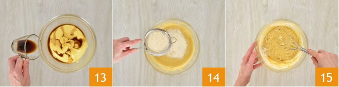 En el primero verted el café a temperatura ambiente 13 y luego la harina tamizada 14, mezclad cuidadosamente con una varilla y dejad aparte 15.