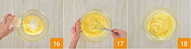 Pasad a la otra masa, verted el coco rallado 16 y mezclad nuevamente con delicadeza usando la varilla 17. Así evitaréis que se desmonte todo 18.