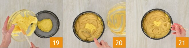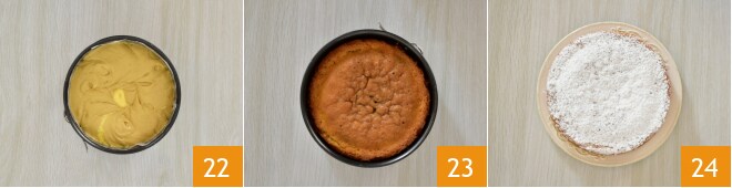 Vuestra tarta está lista para ser horneada 22 en horno estático, precalentado a 180° por unos 45 minutos 23. Tan pronto como esté cocida, dejadla enfriar un poco antes de desmoldarla y dejarla enfriar completamente sobre una rejilla. Finalmente, espolvoread con azúcar glas y trasladad vuestra tarta marmolada de coco y café a un plato para servirla 24.