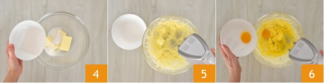 Verted en un cuenco la mantequilla y batid con las varillas eléctricas añadiendo los restantes 120 g de azúcar poco a poco 4 para que se incorpore bien 5. Después de unos minutos, la mezcla resultará clara y espumosa; ahora proceded añadiendo los huevos uno a uno, también así se incorporarán mejor 6.