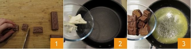 Para preparar la tarta Mars, forrad un molde desmontable de 24 cm con papel de horno. Luego cortad las barritas en trozos 1, después derretid a fuego lento en una sartén o en una cacerola bastante amplia la mantequilla 2. Una vez derretida, añadid las barritas 3, aumentad ligeramente el fuego