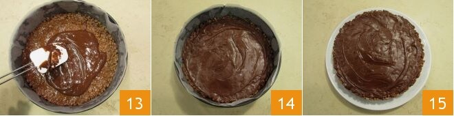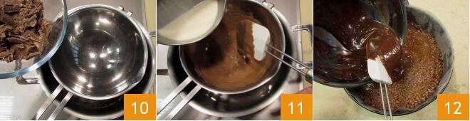 y ponedlo a derretir al baño María 10, mezclando de vez en cuando para favorecer el derretimiento. Mientras tanto, poned la nata a calentar en un cazo. Una vez que el chocolate esté derretido, añadid la nata calentada 11 y mezclad unos instantes, luego vertedlo todo sobre la base de arroz inflado 12.