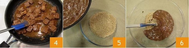 y mezclad todo con una espátula para hacer fundir las barritas, tardará unos minutos 4. Una vez derretidas, tendréis que actuar bastante rápido: quitad rápidamente del fuego y verted en un bol con el arroz inflado 5, mezclad todo brevemente para amalgamarlo 6.