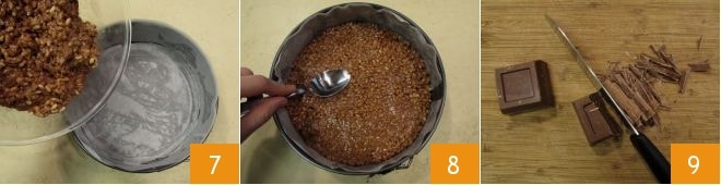 Transferid la mezcla al molde forrado con papel de horno 7, extendid bien la base para cubrir todo el fondo ayudándoos con el dorso de una cuchara 8 y dejadla de momento aparte (fuera de la nevera). Ahora picad el chocolate con leche 9