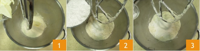 Para preparar la tarta ojo de buey, empezad con la Pasta quebrada. Podéis trabajar con batidora o a mano en el mismo orden. Luego añadid la harina y la mantequilla fría en trozos en el bol 1. Trabajad los ingredientes con el gancho de pala durante un par de minutos antes de añadir el azúcar glas 2 y la sal 3.