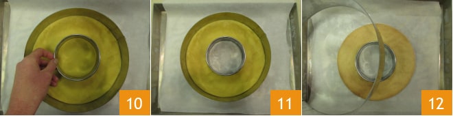 En una de las dos bases, haced un agujero con un cortapastas más pequeño de 10 cm de diámetro 10 y retirad la masa del medio pero no el anillo que servirá para mantener la forma 11. Luego proceded a hornear los dos discos en horno estático a 180° durante 15 minutos; retirad las formas cuando los discos estén enfriados 12.