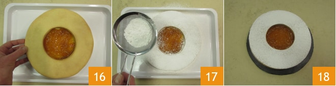 Colocad el segundo disco agujereado y presionad ligeramente con los dedos para que se adhiera bien 16. Decorad la superficie con abundante azúcar glas, sin preocuparos si cae sobre la mermelada ya que después será absorbida, 17 y vuestra tarta ojo de buey está lista 18.