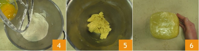Trabajad nuevamente los ingredientes obteniendo una masa arenosa. Añadid también los huevos enteros y las yemas 4. Continuad trabajando la batidora durante unos instantes más hasta que sea homogénea 5. Transferid la masa sobre la mesa, trabajadla rápidamente para compactarla, luego formad un bloque, envolvedlo en film transparente y dejadlo reposar en el frigorífico durante al menos una hora 6.
